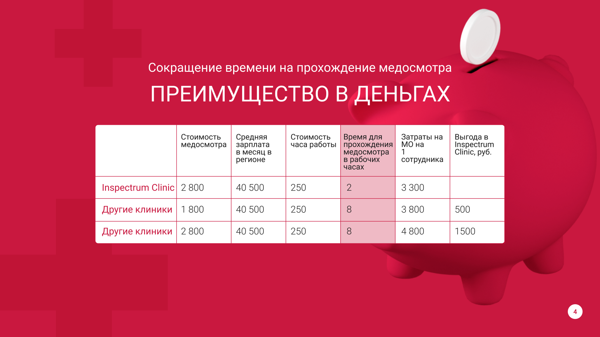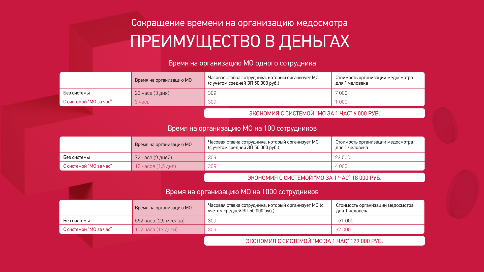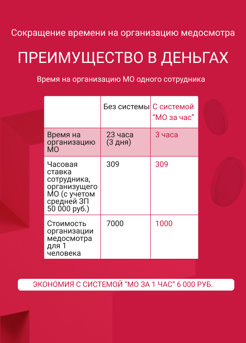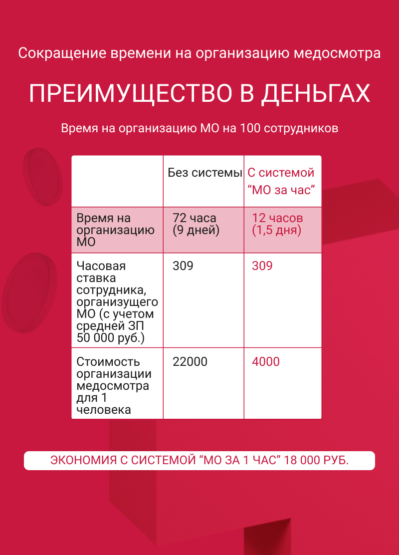 За счет сокращения времени медосмотра до 1 часа с нашим сервисом компания получает экономию в деньгах как на проведении, так и на организации медобследований.